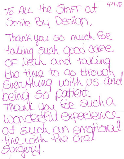 "Just wanted to say thank you to the whole Smile By Design team... the pediatric dentist here is definitely recommended, they provided a great experience for my daughter's first dental appointment. The assistant was able to take x-rays on my daughter who was terrified about her first appointment... she had a huge smile on her face after her appointment... which is a surprise because she usually gets very upset during doctors visits... anyways just wanted to say thank you and I'd definitely recommend this office to anyone looking for a pediatric dentist in Connecticut." - M.T.